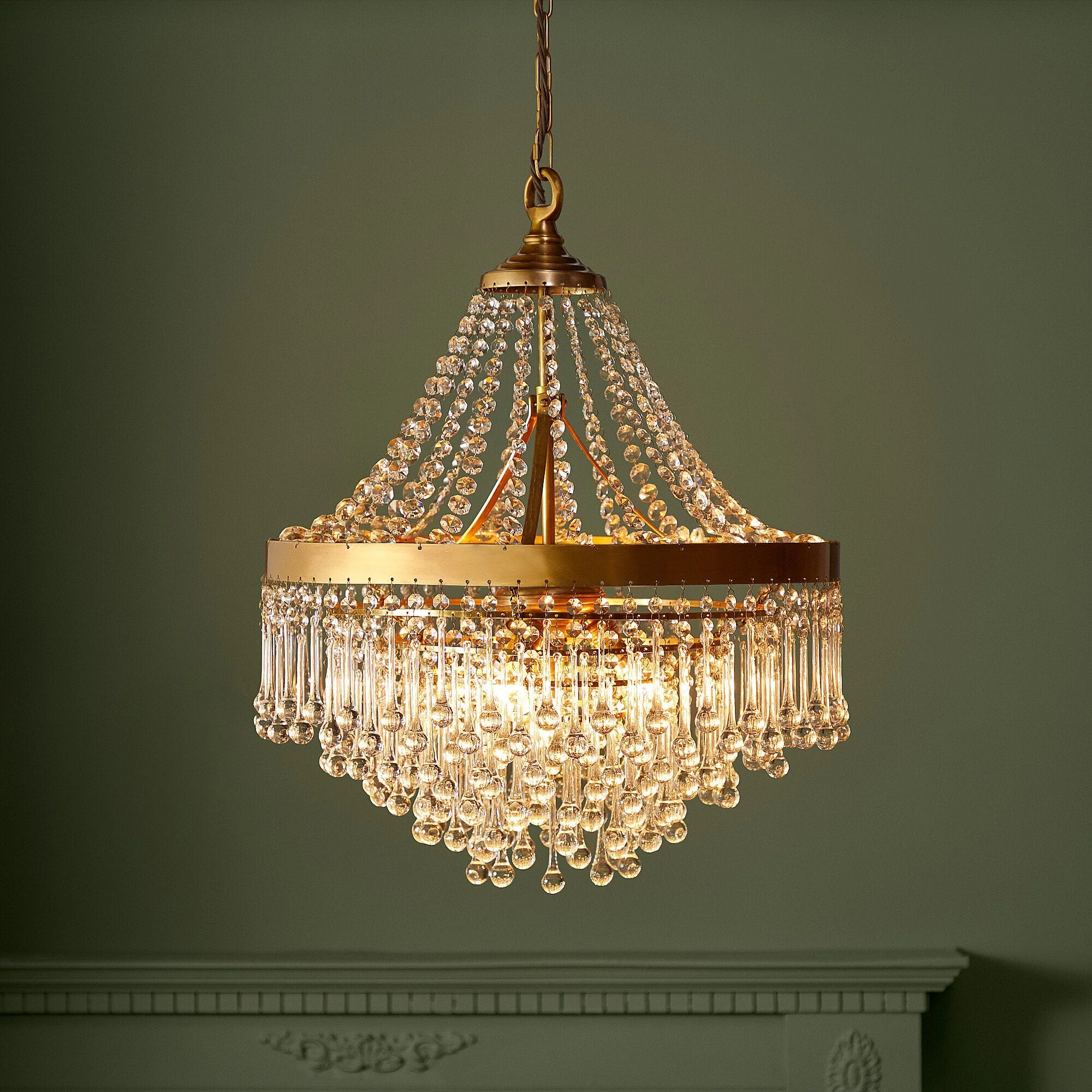 Shakespeare's Juliet was a Capulet. We thought long and hard about how to make this beautiful chandelier elegant, without tipping over the top. We have deliberately kept the central brass belt plain to allow all the glass to do the talking. The shape, we feel, is perfect, and the drops and beads of glass make the light sing. Juliet, we hope, would approve.