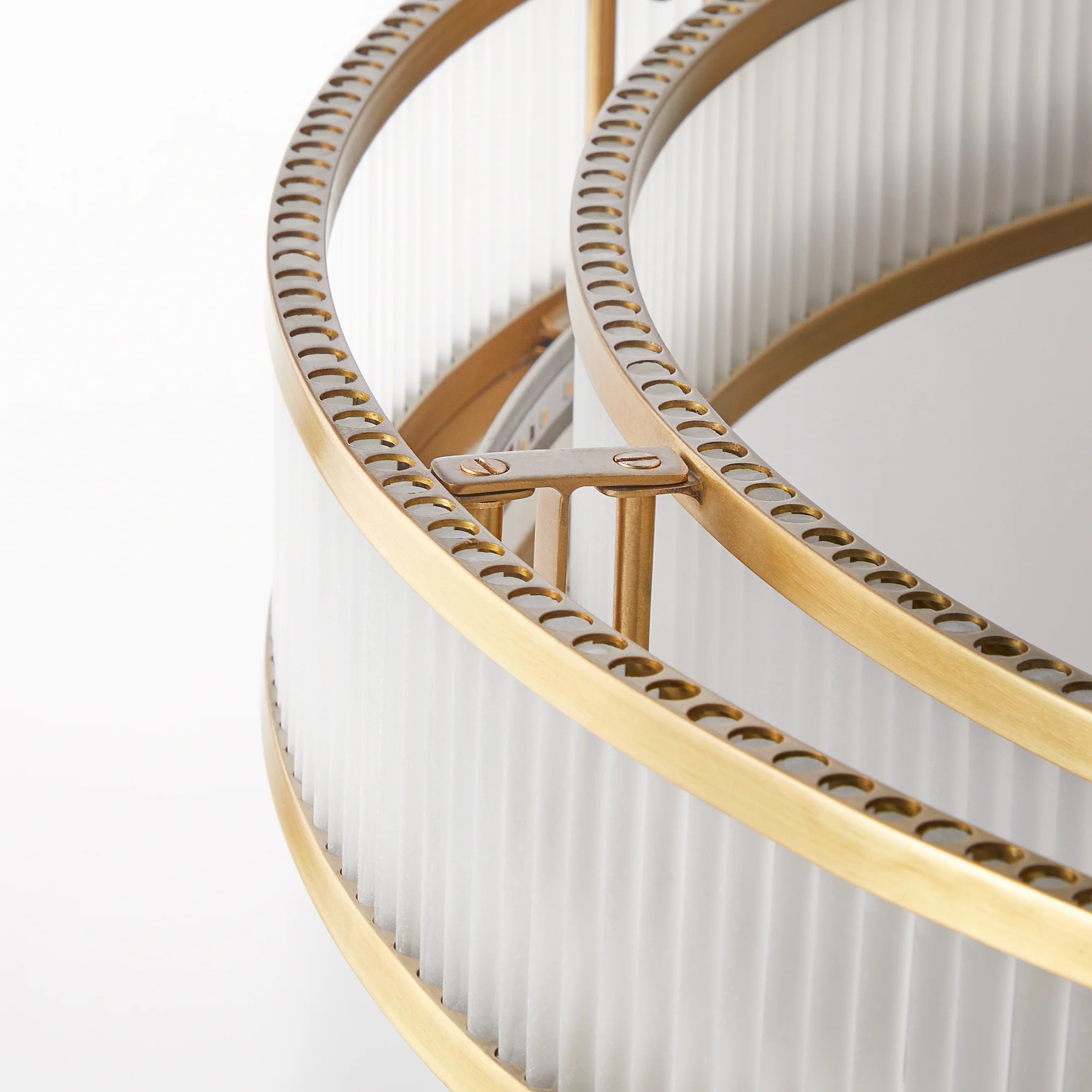 As sleek and streamlined as a galaxy-shuttling spaceship but crafted beautifully from pure brass and handmade glass rods. The happiest marriage of ancient and modern. This is a large and impressive chandelier that will bring a dose of magnificence wherever you choose to hang it. Powered by 24 built-in LEDs, rated for a lifetime of 25,000 hours.