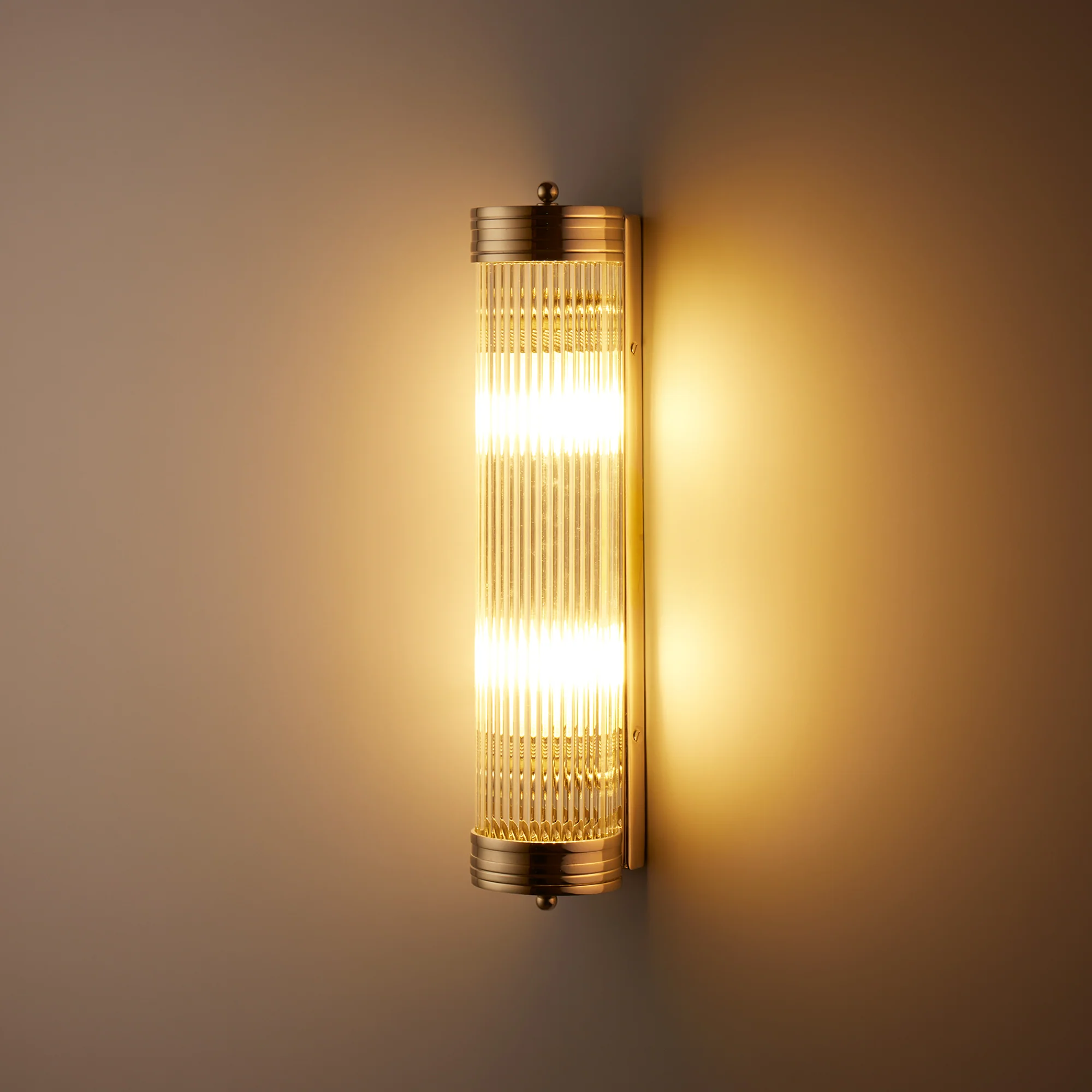 Long Roddy gives you all the glamour of a classic rodded wall light...think gleaming glass, cast brass, and serious Deco vibes, without the fiddly faff. No more painstaking bulb changes, just pull the top and bottom finials to pop off the front. It's IP44 rated too, which means it's as happy in a steamy bathroom as lighting up a hallway or adding symmetry beside a mirror. Streamlined, stunning, and fuss-free. What's not to love?