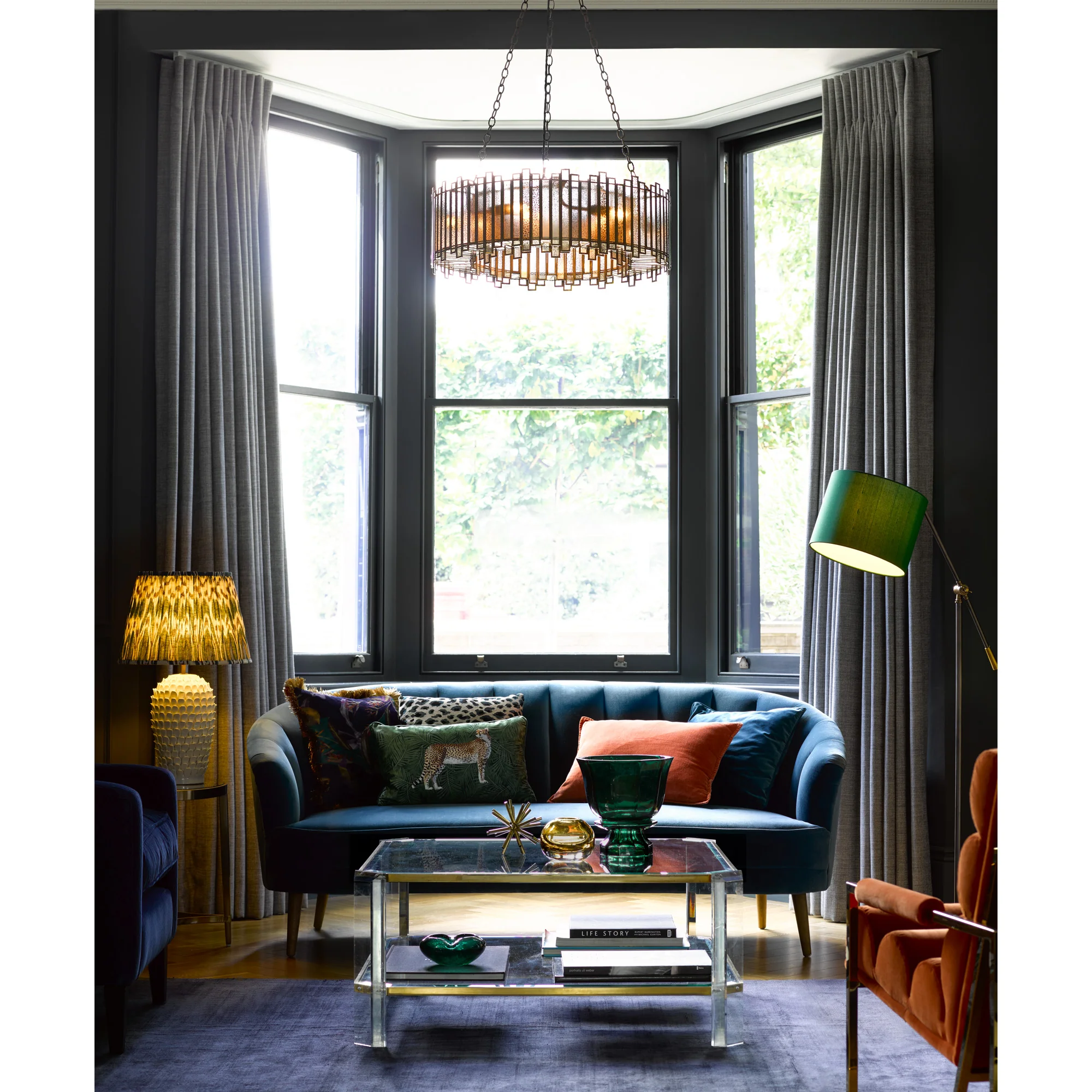 Multi-faceted in a literal sense, this chandelier can definitely claim show-stopping qualities. There's a whole lot going on here. First there's an inner ring of vertical rectangular brass and glass panels, then there's an outer ring of even more vertical brass and glass panels. The two vertical rings are linked at the bottom with yet another ring of brass and glass panels, this time horizontal. 6 bulbs and beautiful mercurised finish to the glass. It's intricate, it's bold, it's a beauty. Light up your lair in some style!