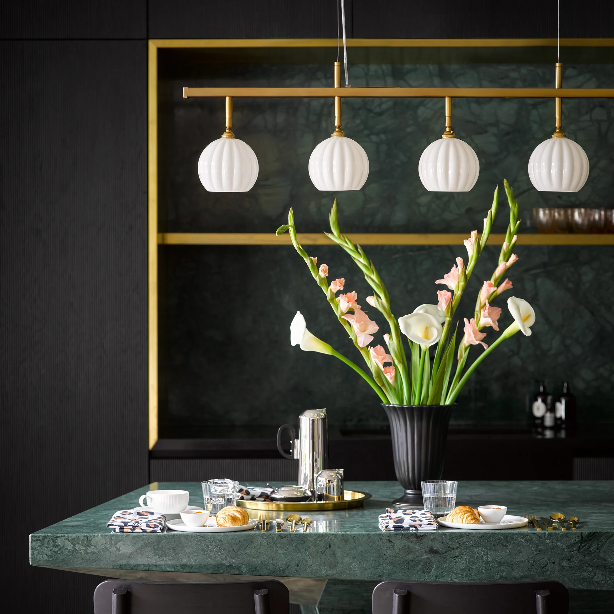 Yup, you got it....Penta - five lights, and well....fabulous. Long, imposing and stylish, without dominating. We worked hard on the precise dimensions and changed several times before we settled here. Perfect over a kitchen island. Combine with all manner of fabric, card, glass, brass or ceramic shades. Yes please! (Shades not included)
