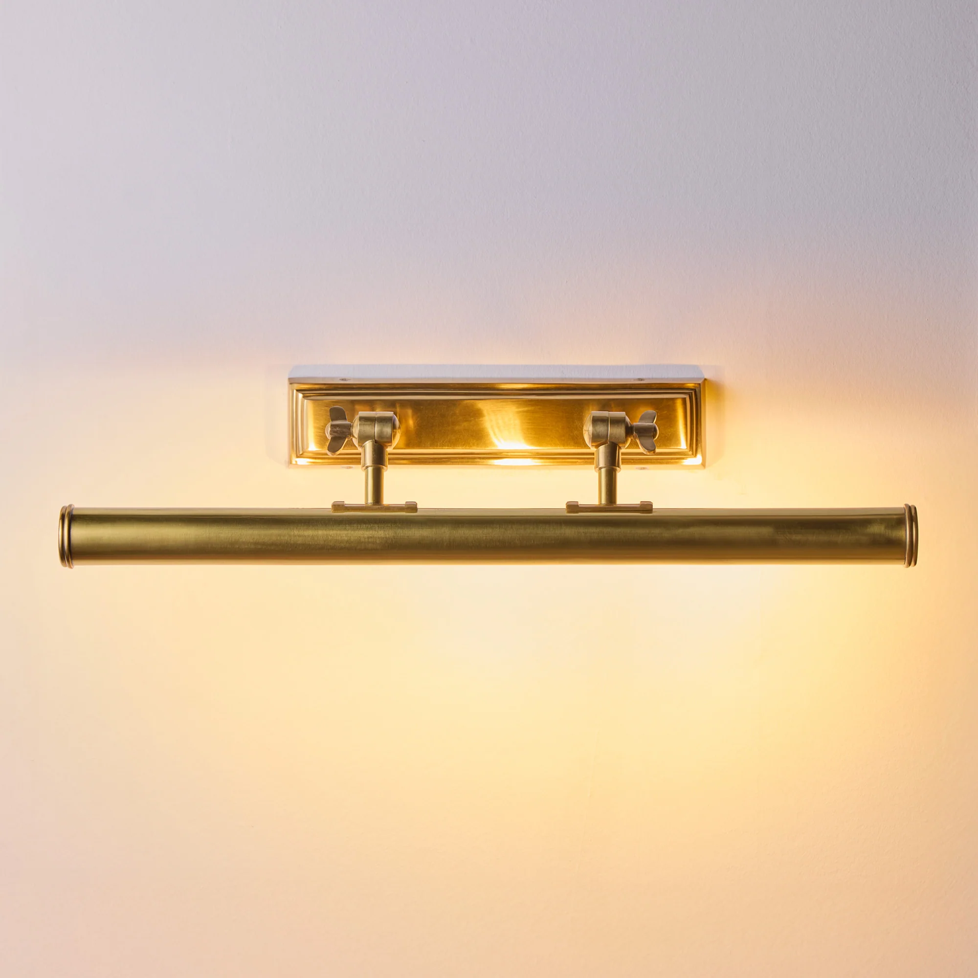 Forgive the name Pitcheroo…it’s silly, puerile and doesn’t do justice to the majesty and class of these stunning picture lights. We are thrilled with them – all the proportions and little details just seem to work and balance – and, in 100% solid bass, they will last forever. Seen here in wide format, with two supporting arms.